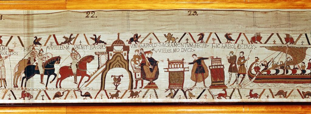 The Battle Museum, The Almonry, stands at the junction of Mount Street and the High Street. The only relic of the battle, an eleventh century battle axe, is kept here with a number of engravings depicting the Bayeux Tapestry. The ‘tapestry’ is not woven as the name suggests but embroidered with woollen yarn onto seventy metres of linen. It shows in graphic detail events leading up to the invasion, and the battle that lead to the Norman Conquest of England. Legend has it that it was made by William the Conqueror’s wife, but it is thought to have been commissioned by Bishop Odo of Bayeux, William’s half brother, and made in England by monks. While there is an embroidered replica in the Museum of Reading – the original can be seen, wonderfully displayed, in the Musee de la Tapisserie in Bayeux, Normandy.