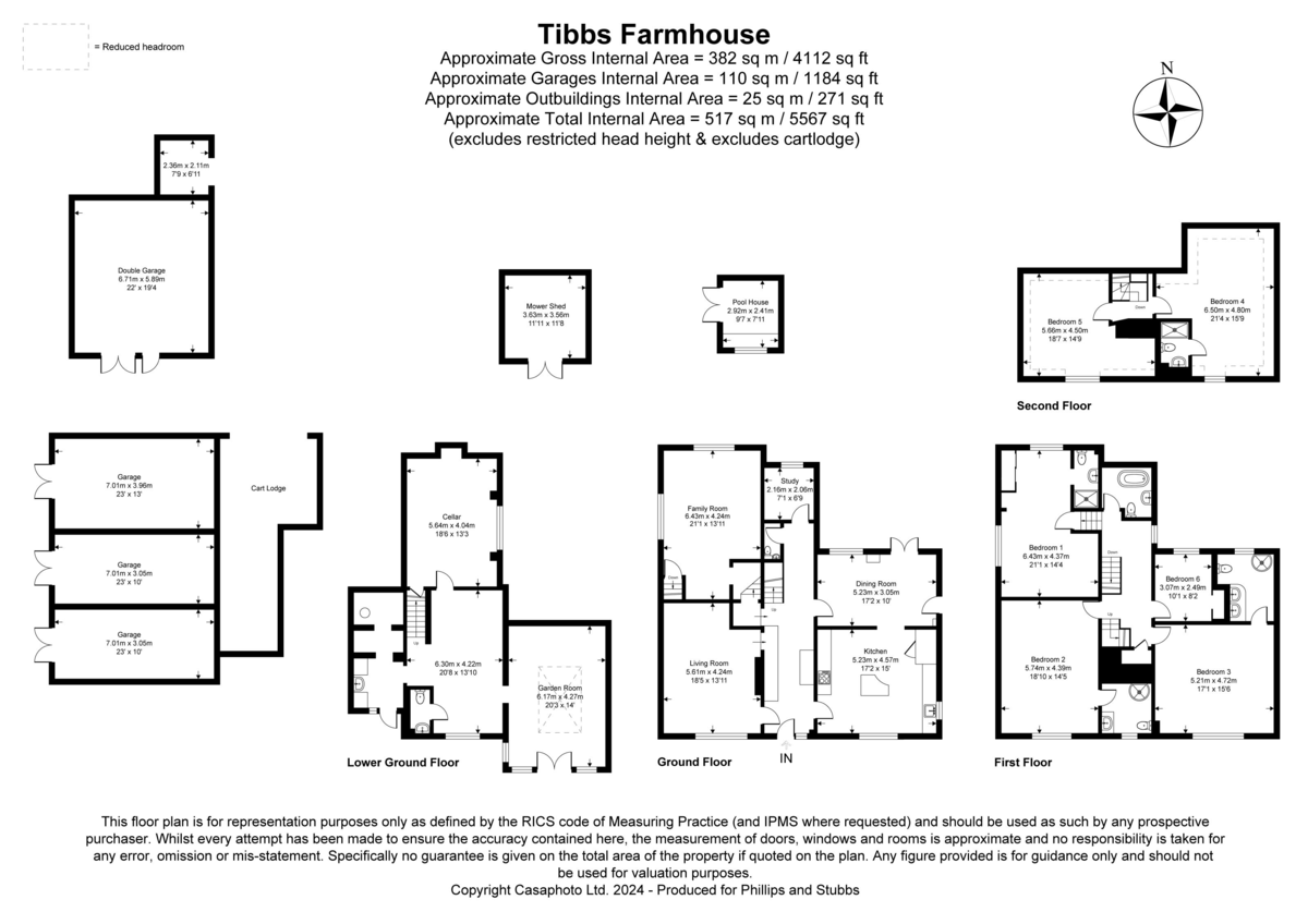 ROOMS Entrance hall, Living room, Family room, Dining room, Kitchen/breakfast room, Study, Cloakroom, Lower ground floor, Gym, Garden room, Cellar, Utility room, Cloakroom.First floor landing, Bedrooms 1,2 and 3 all have en suite shower rooms, Bedroom 6, Family bathroom. Second floor attic bedrooms 4 and 5. Oil heating, Double garage,Triple garage with cart lodge, Swimming pool and pool house, Mower shed, Gardens and adjoining paddock in all approx. 5.9 acres (to be verified)